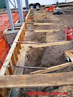 Щитовую часть изготавливают из доски минимум 2-2.5 см толщиной и 150-200 мм шириной, учитывая общую высоту следует понимать, что куб бетонной смеси имеет вес около 2.4 тонны и при высоте опалубки в 1 метр на нижнюю её часть будет создаваться довольно большое давление. Набрав необходимую поверхность, скрепляют поперечным балками из бруса (сшивная планка), с расстоянием исходя из геометрических параметров конструкции от пол до одного метра. Гвозди нужно вбивать со внутренней стороны щита, которая обращена к заливаемому бетону. Гвозди требуется подбирать больше общесуммарной толщины доски и бруса на 10-20мм. При выступании концов гвоздей из поверхности опалубки их необходимо загнуть перепендикулярно. Размеры досок для опалубки лучше подбирать исходя из параметров конструкции, при этом важно учитывать вес доски, ее должен в состоянии поднимать и переносить один рабочий. Опалубку собирают по опалубочным чертежам, придерживаясь осям и отметкам, которые указаны в проекте.